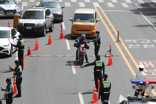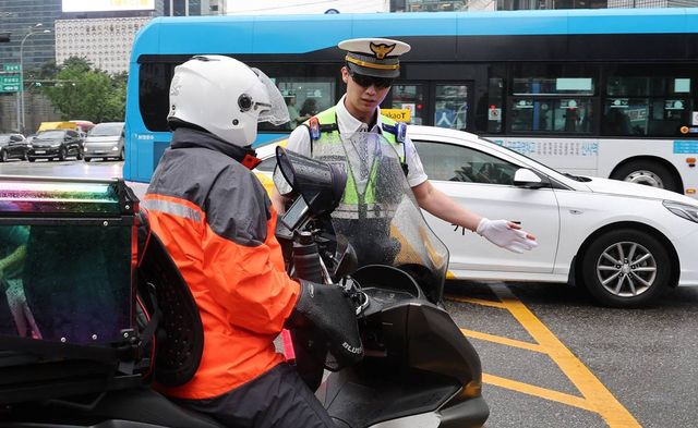 교통경찰이 서울 강남역 사거리에서 5대 반칙 운전과 이륜차 무질서 운행 집중 단속을 하고 있다 / 뉴스1