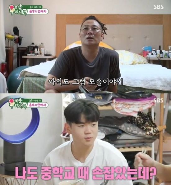윤민수는 "아직도 모솔(모태솔로)이냐. (이종혁의 아들) 준수는 중학교 때 연애하면서 손도 잡아보고 그랬다더라"고 얘기했다.