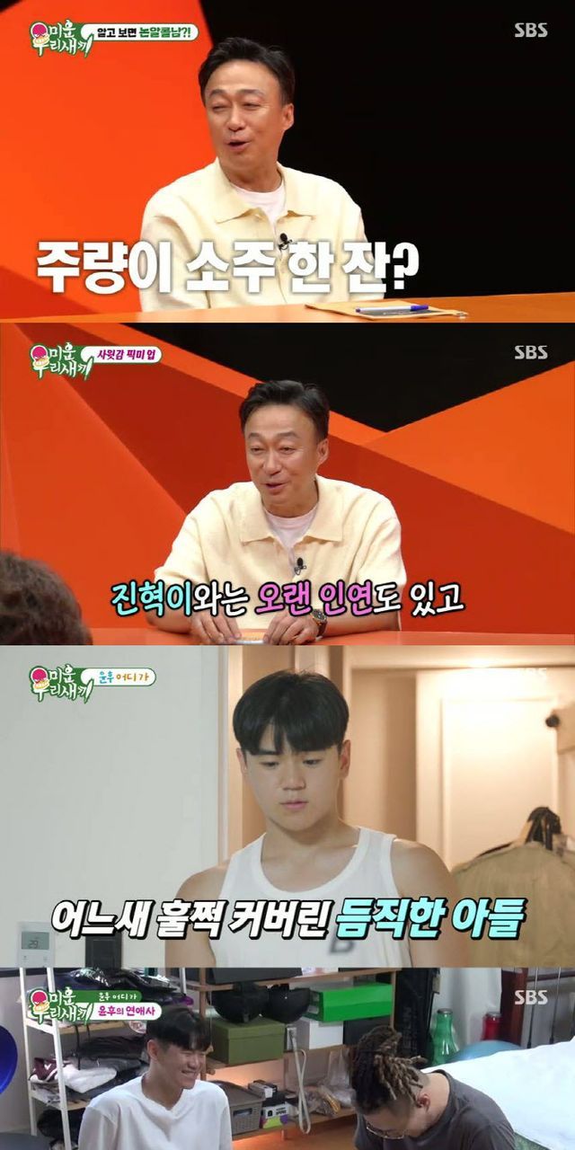 최근 ‘미우새’에 새롭게 합류해 이혼 후에도 전 아내와 한 집에 살고 있는 근황을 공개해 화제를 모은 윤민수가 이날은 아들 윤후와 함께한 일상을 공개했다. 훌쩍 큰 모습으로 모두를 놀라게 한 윤후는 수준급 운동 실력을 뽐내는가 하면 아빠를 위해 직접 식사를 준비하기도 했다. 또한 모태솔로로 알려졌던 윤후는 “모솔 아니다”라고 연애 경험이 있다고 고백하며 DM으로 차였다고 털어놨다. 이어 윤후는 “고등학교 1학년 때였으니까. 그때부터 공부 열심히 했다”고 했고, 윤민수는 “어쩐지 그때 성적이 좋더라”고 해 웃음을 자아냈다. 이후에도 윤민수는 아들의 연애사에 대해 유도신문하며 애정 어린 집념을 보여줬고, 윤후는 이를 받아치며 친근한 부자 케미를 보였다.