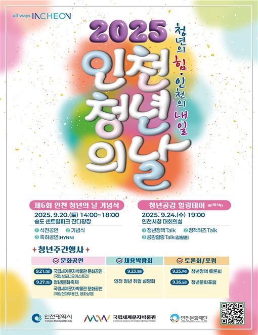 [파이낸셜경제=김영란 기자] 인천광역시는 9월 20일부터 27일까지 ‘2025년 인천 청년주간’을 운영하며 ‘청년의 힘! 인천의 내일’을 주제로 청년과 시민 모두가 함께하는 축제의 장을 마련한다고 밝혔다.