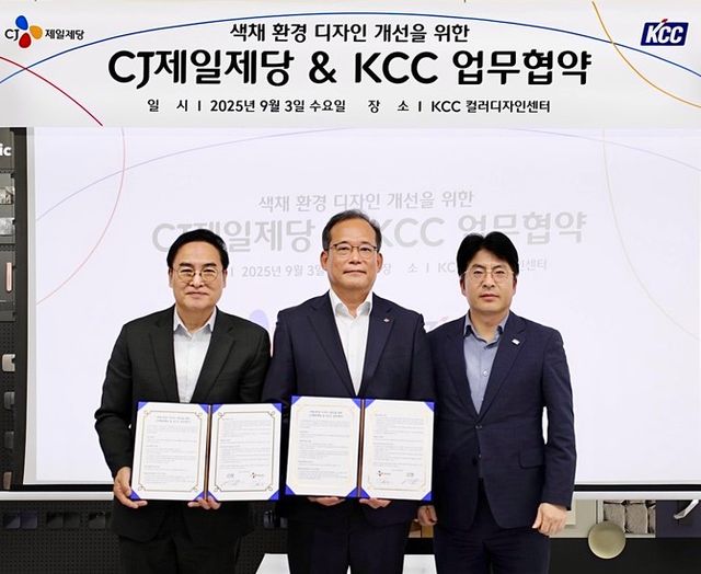(왼쪽부터)맹희재 KCC 컬러디자인센터장(상무), 김태호 CJ제일제당 안전경영실장(부사장), 함성수 KCC 유통도료 사업부장(상무). ⓒ CJ제일제당