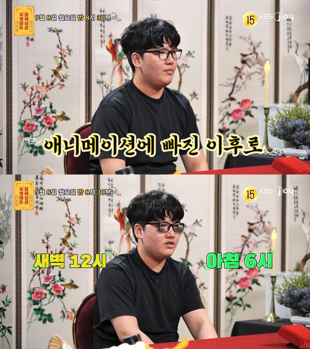 그는 '건어물 여동생 우마루짱', '봇치 더 록' 등을 즐겨 보며 새벽 12시부터 아침 6시까지 애니메이션을 시청한다고 밝혀 MC들을 놀라게 한다. 심지어 부모님 몰래 집 베란다의 어두운 아지트에서 영상을 보느라 시력이 나빠져 안경까지 쓰게 됐다고 고백한다.