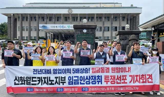 노조는 “지난해 신화월드는 전년 대비 영업이익이 5배가 상승했고, 약 350억원의 이익을 벌었다”며 “그러나 회사는 물가인상률과 같은 임금 인상 평균 3%를 제시했다. 이는 실질적 동결이나 임금 삭감과 마찬가지”라고 주장했다.