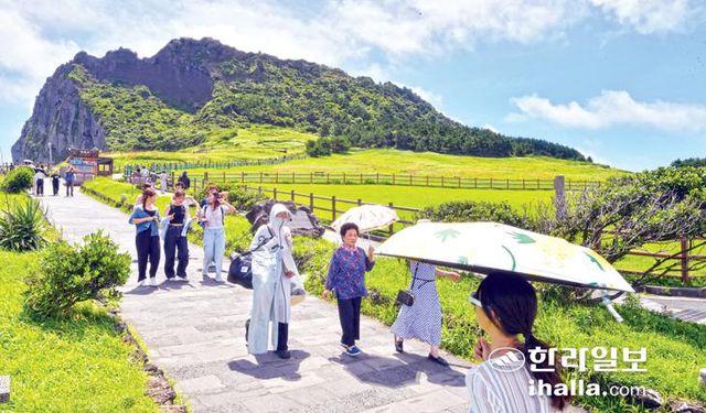 성산일출봉을 찾은 양산을 쓴 관광객. 한라일보DB