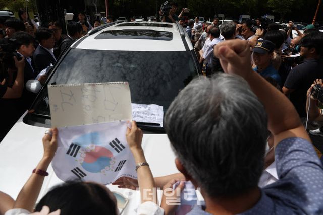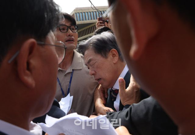 | [이데일리 노진환 기자] 김형석 독립기념관장이 8일 오전 서울 여의도 국회 소통관에서 기자회견 후 퇴진을 요구하는 시민단체 회원들의 항의를 받으며 국회를 나서고 있다. |