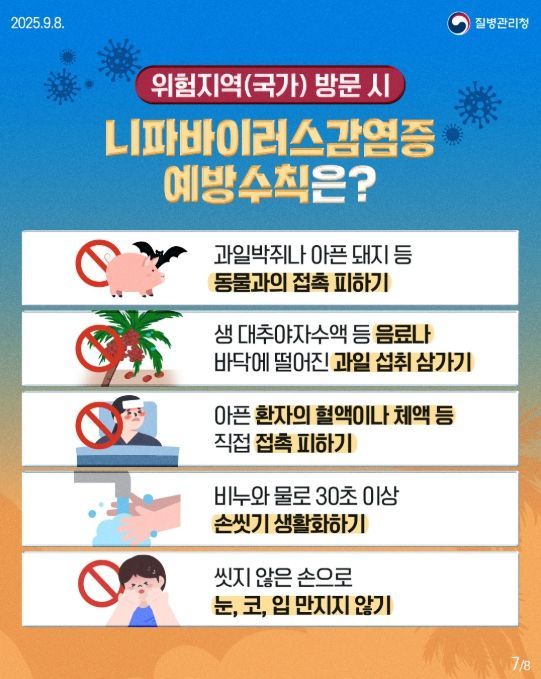 과일박쥐 서식 구역 내 아시아 국가들에서 산발적으로 발생하고 있으며, 특히 최근에도 인도와 방글라데시에서 환자 발생이 보고된 바 있어 해당 국가 방문 시 주의가 필요하다.