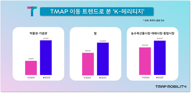 티맵모빌리티 관계자는 "박물관·사찰·시장을 중심으로 이동이 늘어나면서 일상 속에서도 K헤리티지에 대한 관심이 뚜렷해졌다"며 "앞으로도 주행 데이터를 정교하게 분석해 생활 변화를 포착하고, 이용자가 원하는 장소를 더 쉽게 찾고 즐길 수 있도록 서비스를 고도화해 나가겠다"고 말했다.
