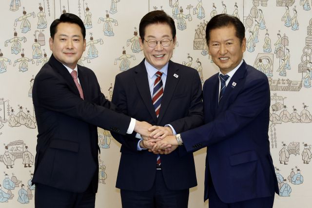 취임 100일을 앞둔 이재명 대통령이 8일 정청래 더불어민주당 대표, 장동혁 국민의힘 대표와 오찬 회동을 가졌다. 이 대통령의 여야 대표 회동은 지난 6월 22일 이후 78일만이며 지난달 여야에 정식 지도부가 출범한 이후 처음이다. 이날 회동을 계기로 양당 대표도 처음으로 악수를 나눴다.