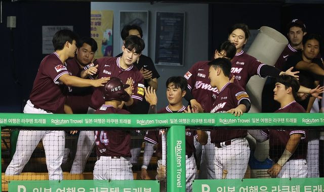 지난달 29일 오후 서울 송파구 잠실야구장에서 열린 프로야구 '2025 신한 SOL뱅크 KBO 리그' 키움 히어로즈와 LG 트윈스의 경기, 키움 송성문이 5회초 2사 3루 상황 이주형의 적시타 때 득점에 성공한 후 동료들의 축하를 받고 있다. / 뉴스1