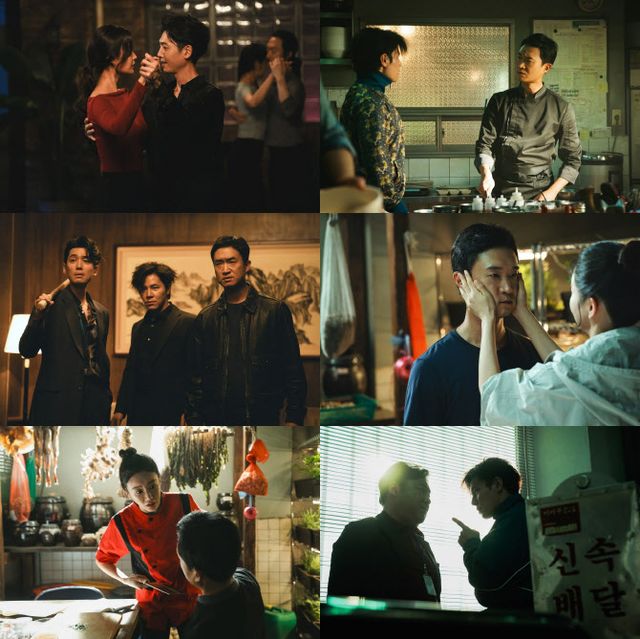 한편, ‘식구파’ 2인자인 순태가 조직에서 포스 넘치는 모습과 상반되게 화려하게 조각된 음식을 앞에 두고 진지하게 바라보고 있거나 자신이 원치 않는 보스 자리를 맡을 위기에 처하자 망연자실한 표정을 짓고 있는 모습들이 유쾌한 웃음을 자아낸다. 동시에 중식당 ‘미미루’의 주방장으로서 자신의 손맛으로 전국 맛집을 접수하려는 남다른 ‘추구미’를 가진 순태의 앞날이 어떻게 흘러갈지 호기심을 유발한다. 또한 조직의 정통 후계자인 강표가 탱고 선생님 연임(정유진 분)과 함께 넘쳐흐르는 끼를 발산하는 스틸과 언더커버 경찰로 조직에 잠입한 태규(이규형 분)가 순태와 친숙하게 대화를 나누는 스틸은 본캐는 잠시 접어두고 부캐에 극도로 몰입해 있는 캐릭터들의 모습을 예고하며 코믹한 매력을 물씬 풍긴다. 여기에 순태, 강표, 태규가 심각한 표정으로 나란히 서 있는 모습과 중식도를 들고 순태를 협박하는 그의 아내이자 ‘미미루’의 실세인 지영(황우슬혜 분)의 모습, 태규가 ‘미미루’의 배달원 차림으로 경찰 상사 추과장(고창석 분)을 만나는 스틸은 배우들의 맛깔나는 티키타카와 코믹 연기 앙상블을 기대케 하며 영화에 대한 궁금증을 자극한다.