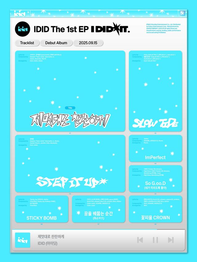 스타쉽은 지난 7일 아이딧(IDID·장용훈, 김민재, 박원빈, 추유찬, 박성현, 백준혁, 정세민)의 첫 번째 미니 앨범 ‘아이 디드 잇.(I did it.)’의 트랙 리스트를 공개했다. 아이스 블루 무드의 스킨으로 이뤄진 트랙리스트는 음악 재생 프로그램의 팝업창 느낌으로 하이틴 감성을 채워 세상에서 단 하나뿐인 아이딧(IDID)만의 청량미를 예고했다.