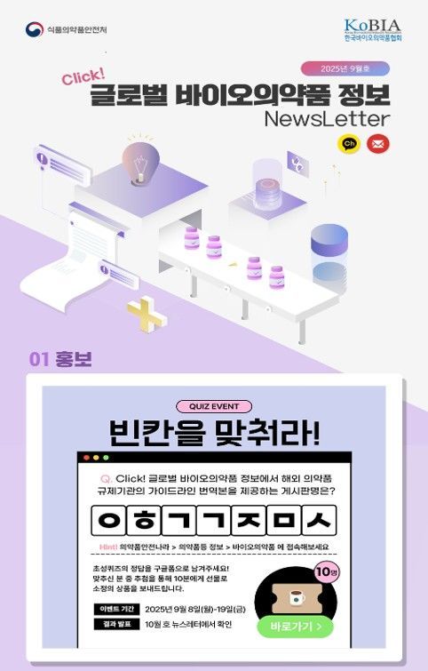 뉴시스 보도에 따르면, 식약처는 의약품안전나라 누리집에서 운영 중인 게시판 'Click! 글로벌 바이오의약품 정보'를 알리기 위해 '초성 퀴즈 이벤트'를 오는 19일까지 진행한다고 8일 밝혔다.