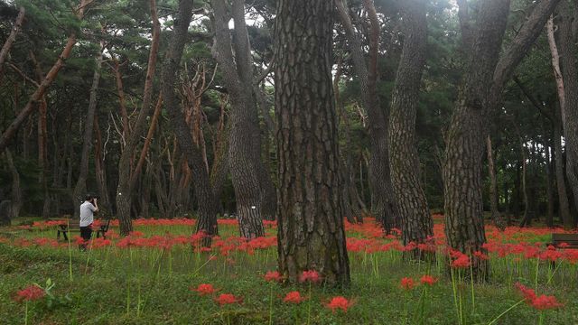 남 거창군 웅양면 동호숲 소나무 사이로 꽃무릇이 활짝 펴 있다. / 거창군 제공(2024년 10월 1일 촬영)
