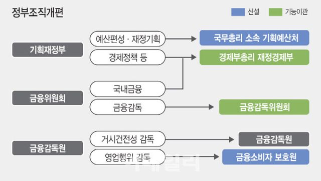 8일 정부와 여당이 확정한 정부 조직개편안에 따르면 금융위원회의 국내 금융 기능을 재정경제부로 이관하고 금융위는 금융감독 기능 수행을 위해 금융감독위원회로 개편한다. 금융감독원은 존치하지만 내부 조직인 금융소비자보호처가 금융소비자보호원으로 분리된다. 금감원과 금소원은 각각 공공기관으로 지정하기로 했다.