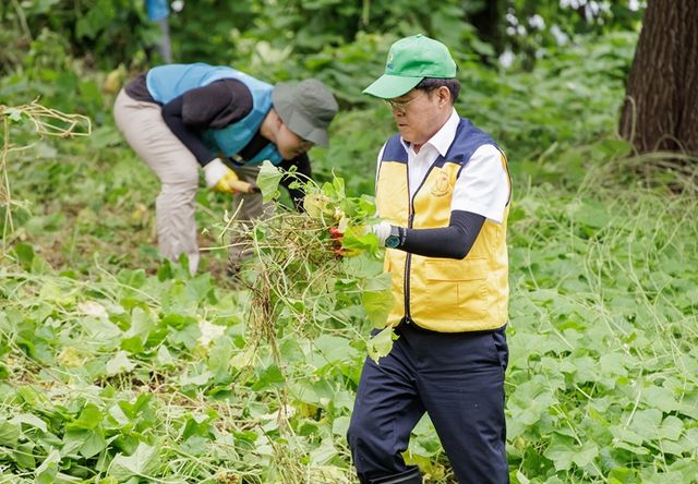 진 구청장도 장화, 목장갑, 낫, 노란 봉사조끼로 작업 채비를 갖춘 채 1시간가량 현장을 누비며 구슬땀을 흘렸다.