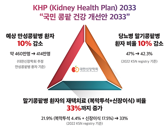 KHP 2033은 국민의 콩팥건강 증진과 환자 삶의 질 향상을 위해 학회가 2023년 4월 처음으로 선포한 정책으로 ▲만성콩팥병 환자 수 10% 감소 ▲당뇨병으로 인한 말기콩팥병 환자 비율 10% 감소 ▲말기콩팥병 환자의 재택치료(복막투석·신장이식) 비율 33% 달성 등 세 가지 핵심 목표가 담겨 있다.