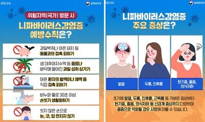 질병관리청은 니파바이러스감염증 감염예방수칙으로 ▲(야생)동물과의 접촉 피하기 ▲오염된 음료나 식품 섭취 금지 ▲환자와 직접 접촉 피하기 ▲손씻기 등 개인위생수칙 준수를 강조했다.