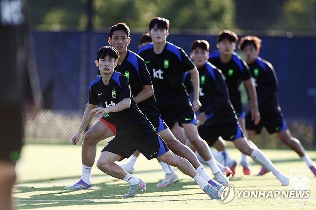 한국 축구대표팀 선수들이 8일(한국시간) 미국 테네시주 내슈빌의 내슈빌SC 훈련장에서 멕시코와의 경기를 앞두고 훈련을 하고 있다 / 연합뉴스, 대한축구협회 제공