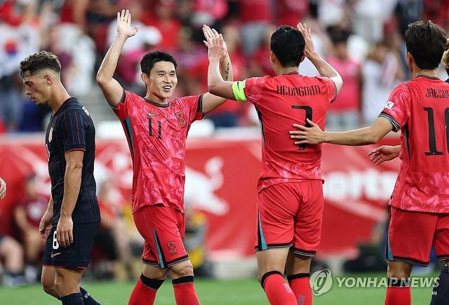 6일(현지시간) 미국 뉴저지주 해리슨 스포츠일러스트레이티드 스타디움에서 열린 한국 대 미국 친선경기에서 한국 이동경이 추가골을 넣은 후 동료들과 함께 기뻐하고 있다 / 연합뉴스