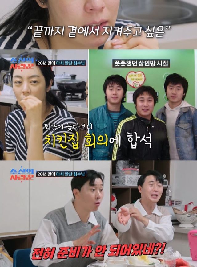 이어 김병만과 함께 이상호&이상민이 집에 도착했다. 이상호는 “저는 치킨 준비하실 줄 알았다”며 2006년 김병만 부부의 교제 당시 아이디어 회의에 자주 참석했던 김병만 아내와의 ‘치킨집 회식’ 추억을 소환했다. 이를 듣던 김병만 아내는 “(그때는) 매일 치킨을 먹었다”며 웃었다. 또 방송에는 김병만 부부의 결혼식 계획도 전해졌다. 애초에 제주도 결혼식을 준비했던 김병만은 “지인들 오기 불편할 것 같아서 한강 야외 결혼식으로 바꿨다”고 소식을 전했다. 이에 김지민은 “나무 타고 등장하는 것 아니냐”고 농담해 웃음을 자아냈다.
