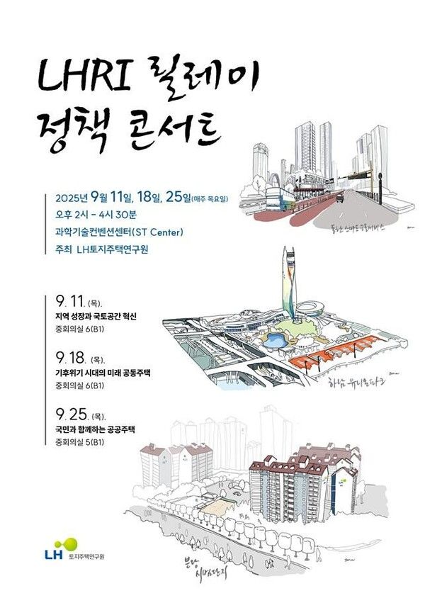 뉴시스 보도에 따르면, 이번 콘서트는 지난해 LHRI 주요 연구 성과를 중심으로 학계·연구기관·정부·민간 전문가가 모여 국토와 주택 정책 미래를 논의하기 위해 마련됐다. 오는 11일부터 매주 목요일 총 3회에 걸쳐 서울 강남 과학기술컨벤션센터(ST Center)에서 진행된다.