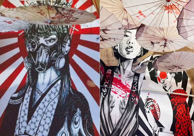 루마니아의 한식당 내부 인테리어에는 정체를 알 수 없는 여성 뒤에 욱일기 문양이 그려져 있어 논란이 일고 있다. 또 다른 그림엔 한국인으로 보이는 여성이 일본어가 적힌 의상을 입은 채, 묘한 표정을 짓고 있는 모습이 담겼다. 다만 해당 그림의 출처가 어딘지, 작가는 누구인지는 알려지지 않았다.