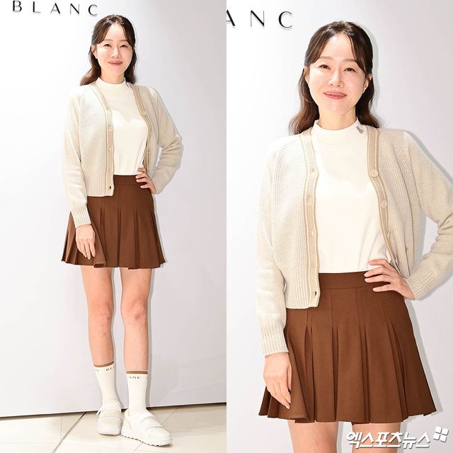 엄지원은 크림색 터틀넥 위에 베이지 컬러의 카디건을 레이어드하며 우아한 스타일링을 선보였다.