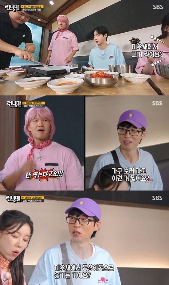 부대찌개 식당을 찾아 식사를 하며 촬영을 이어가던 중 유재석은 "'미우새'에서 가구 보러 가고 이런 것 찍냐"고 넉살을 부렸고, 김종국은 "안 찍는다. 안한다"고 선을 그었다.