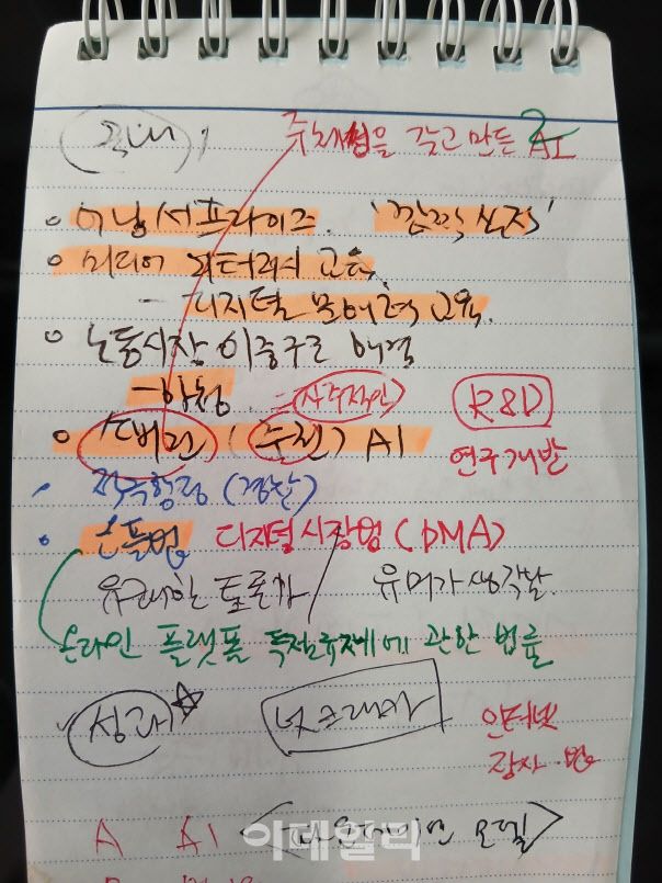 이 때문에 박 통역사의 하루는 15분 남짓한 브리핑만으로 끝나지 않는다. 그는 평일 내내 잠잘 시간을 제외하고는 뉴스를 챙겨본다. 아침 7시 10분이면 시사 라디오로 하루를 시작하고 이후에는 보도채널은 물론 지상파와 종합편성채널 뉴스까지 빠짐없이 모니터링한다. 대통령실 근무 이후 장만한 수첩도 ‘어닝 서프라이즈’, ‘온플법’, ‘프로젝트 베이스 시스템’ 등 까다로운 단어들로 빼곡하다.