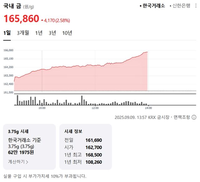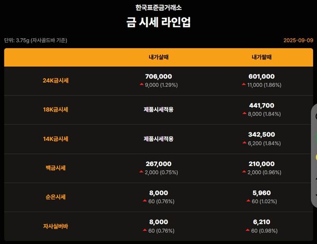 국내 금시세(금값)가 9일(한국 시각) 오후 상승세(전 거래일 대비)를 보이고 있다.