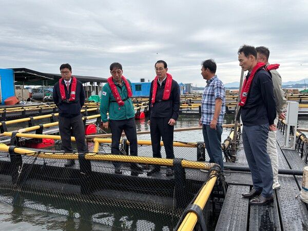 노동진 수협중앙회장(사진 왼쪽 세 번째)이 9일 하동군 양식장을 방문해 적조 피해 상황을 살펴보고 있다.