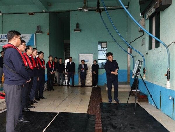 노동진 수협중앙회장(사진 왼쪽 세 번째)이 9일 하동군 양식장을 방문해 적조 피해 상황을 청취하고 있다.