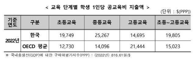 2022년 OECD 평균치는 우리나라보다 적은 1만5023달러였다. 초등교육과 중등교육의 1인당 공교육비 모두 우리나라 지출액이 OECD 평균보다 많았다. 초등교육의 경우 우리나라 학생 1인당 지출액은 1만9749달러였고 중등교육은 2만5267달러였다. OECD 평균은 각각 1만2730달러, 1만4096달러를 기록했다.