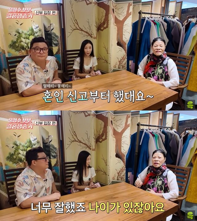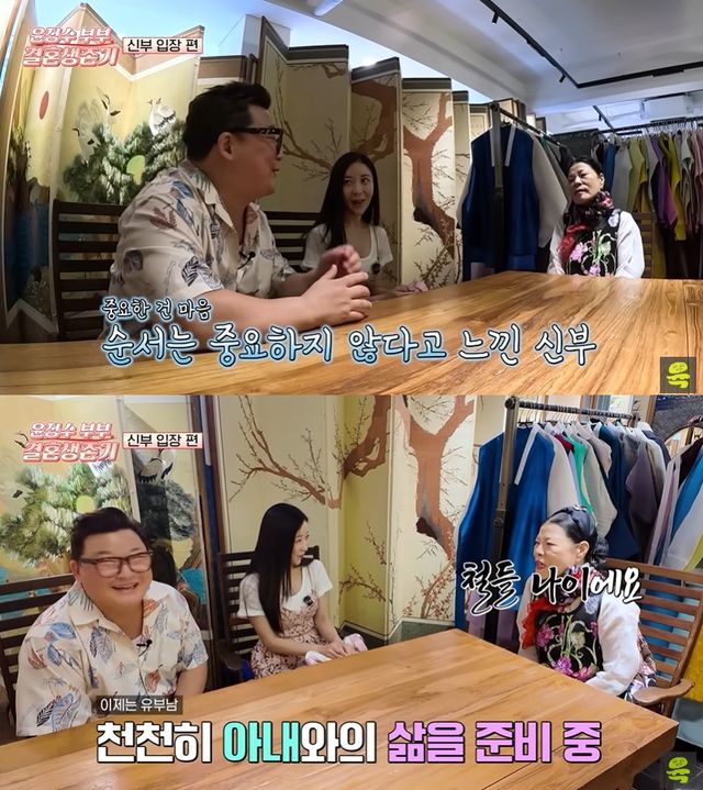이에 윤정수는 "이 친구도 '예식을 올리고 혼인신고를 해야지' 그랬는데 자기도 돌아다니면서 남들 하는 거 보니까 '오빠. 그냥 비슷하게 해도 될 거 같아'라고 하더라"라고 털어놨다. 그는 "오히려 본인이 집안 어르신들을 설득했다. 고맙지, 뭐"라며 예비 신부에 고마운 마음을 전해 눈길을 끌었다.