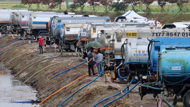 강원 강릉의 한 하천에서 살수차들이 운반급수를 위해 줄지어 취수하고 있다. / 연합뉴스