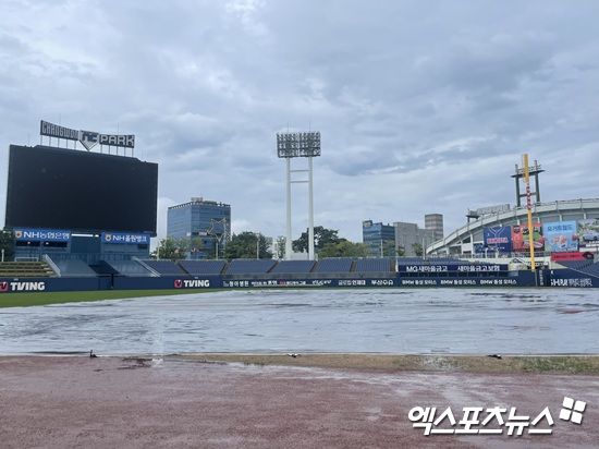 이날 창원NC파크엔 오전부터 비가 내려 대형 방수포가 내야에 깔려 있었다. 오후 잠시 비가 잦아드나 싶었지만, 오후 3시경 다시 비가 떨어지기 시작했다. 오후 4시경엔 이미 외야 워닝트랙과 파울라인 바깥 내야에 깊은 물웅덩이가 생겼다