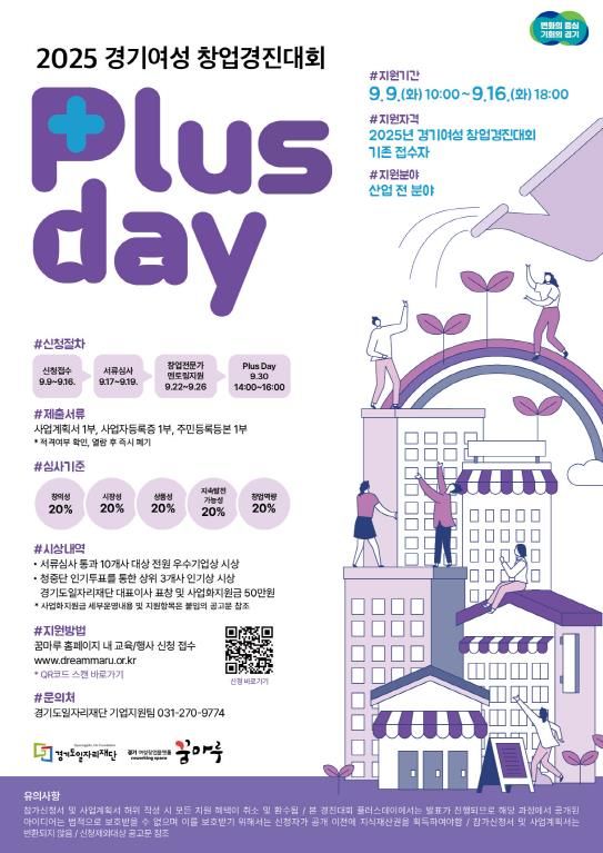 [파이낸셜경제=김영란 기자] 경기도와 경기도일자리재단은 9월 9일부터 16일까지 2025년 여성창업경진대회 후속 행사인 ‘Plus Day(플러스 데이)’ 참가자를 모집한다. 이번 행사는 지난 5월 본 대회에서 17대 1의 높은 경쟁률로 아쉽게 탈락한 여성 창업자를 대상으로 마련됐다.
