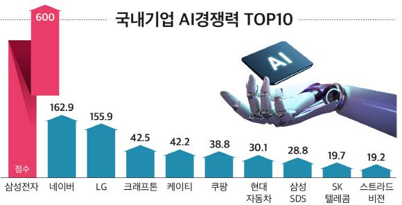 이어 K-게임 대표주자인 크래프톤를 비롯해 KT, 쿠팡, 현대차, 삼성SDS, SK텔레콤, 스트라드비젼 등이 AI 경쟁력 10위권 내에 이름을 올렸다.