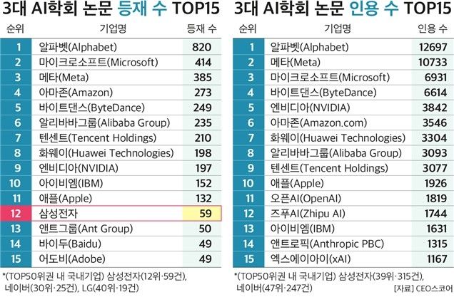 3대 AI 학회 논문 인용 수로는 삼성전자(39위), 네이버(47위) 등 2곳만 50위권에 들었다.
