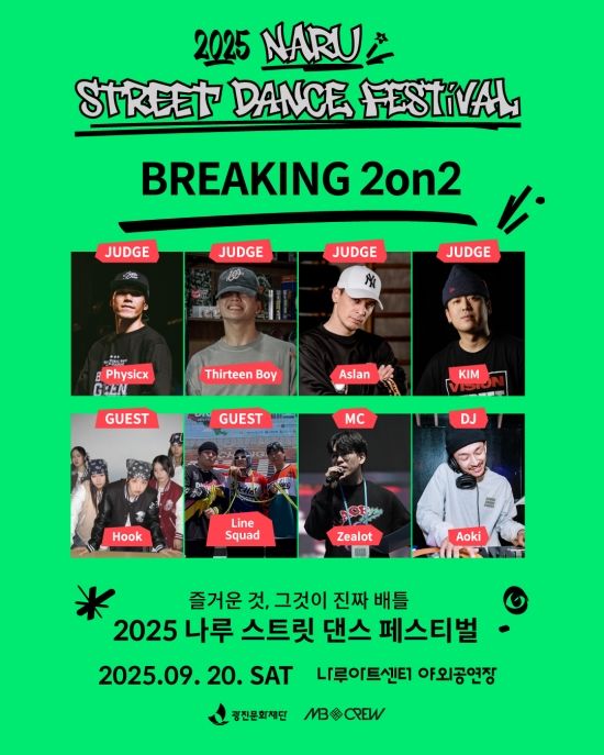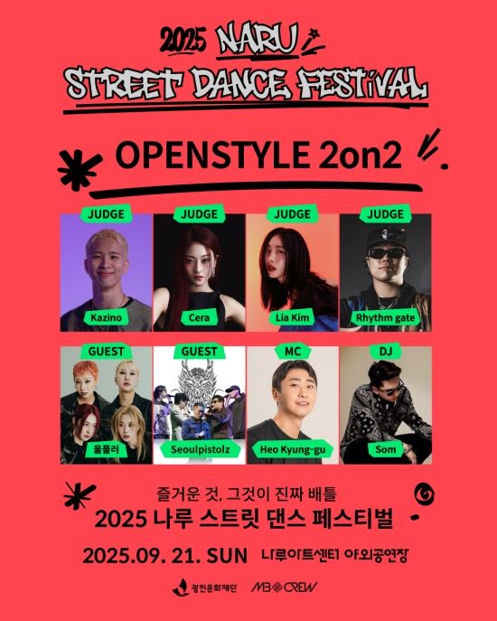 총 우승 상금 1천 5백만원(1,500만원)을 두고 펼치는 '2025 나루 스트릿 댄스 페스티벌'은 20일(토) 브레이킹, 21일(일) 오픈 스타일 장르 2대2 배틀로 각각 진행되며, 전 세계를 무대로 활동 중인 대한민국 대표 댄서들이 심사위원 및 게스트로 참여한다.