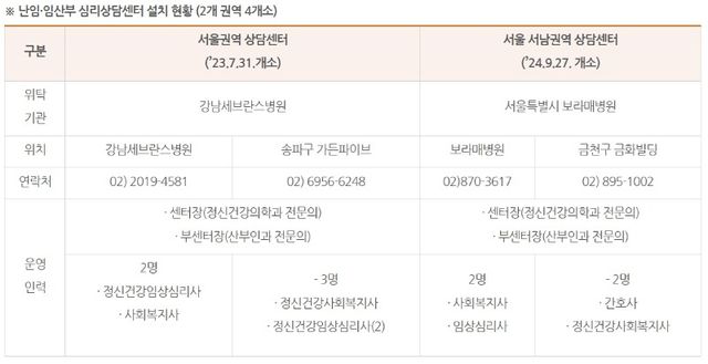 상담은 ‘서울권역 난임·임산부심리상담센터’(www.mindcare-for-family.kr)와 ‘서남권역 난임·임산부심리상담센터’(www.fmc.or.kr)를 통해 예약할 수 있으며, 신청 문의는 (사)한국난임가족연합회(02-3431-3382)로 하면 된다.