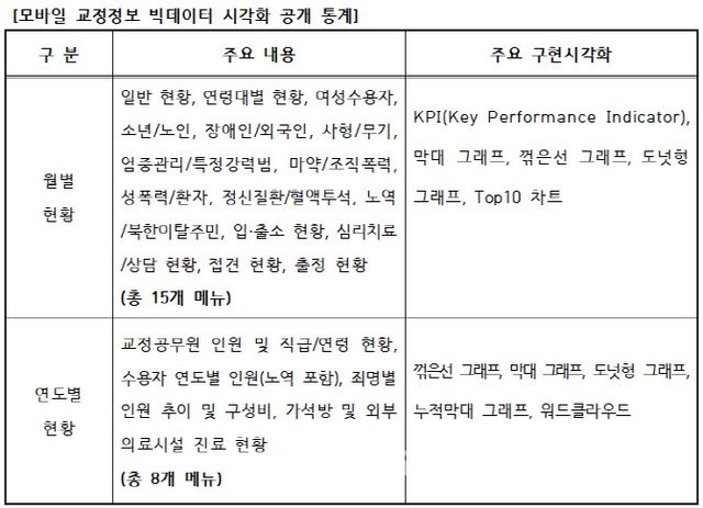 모바일 교정정보 빅데이터 시각화 서비스는 전국 교정시설 현황 및 1일 평균 수용인원, 월별 전체 수용인원, 연령대별 현황, 연도별 교정공무원 현황 등을 제공한다.