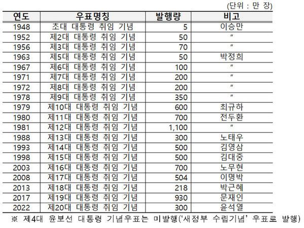 우리나라의 첫 대통령 기념우표는 1948년 이승만 초대 대통령 취임 기념우표로 5만장이 발행됐다. 이후 두 번을 더 연임한 이승만 대통령은 발행 물량을 10배 수준으로 늘려 각각 50만장과 70만장을 판매했다.