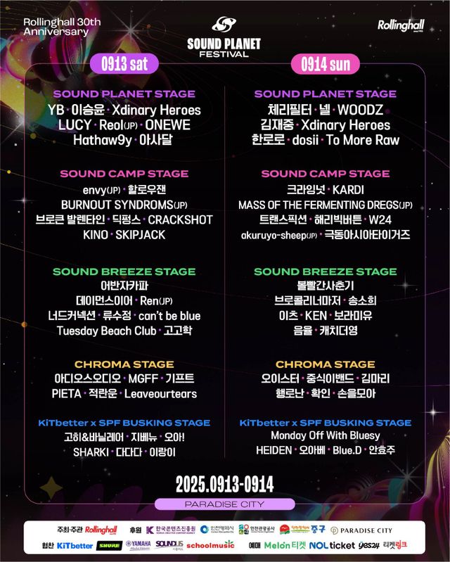 공연은 국내 최대 규모를 자랑하는 5개 스테이지(사운드플래닛·사운드캠프·사운드브리즈·크로마·버스킹)에서 펼쳐진다. 특히 YB와 엑스디너리 히어로즈, 체리필터와 우즈의 특별 콜라보 무대가 준비돼 기존 페스티벌과 차별화된 경험을 선사할 전망이다.