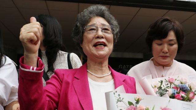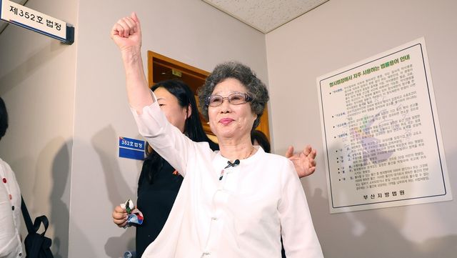61년 전 자신을 성폭행하려던 남성의 혀를 깨물어 중상해 혐의 유죄 판결을 받았던 최말자(78) 씨가 지난 7월 부산지법에서 열린 재심 첫 공판을 마치고 법정을 나서며 "이겼습니다"를 외치고 있다. / 연합뉴스