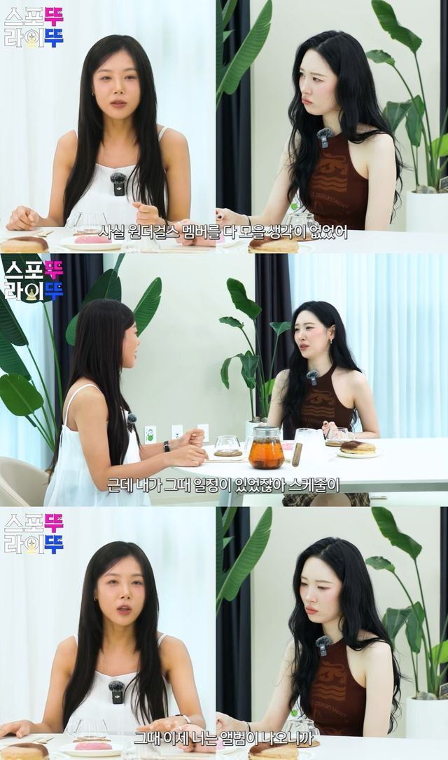 이에 유빈은 "사실 원더걸스 멤버들 다 모을 생각은 없었다"며 "우선 내가 편한 사람들한테 연락을 돌렸는데, 선미는 앨범이 나오니까 (앨범 내면서) 같이 나오기로 하고 소희와 선예와 혜림이 날짜가 맞아서 나왔다"고 부연했다.