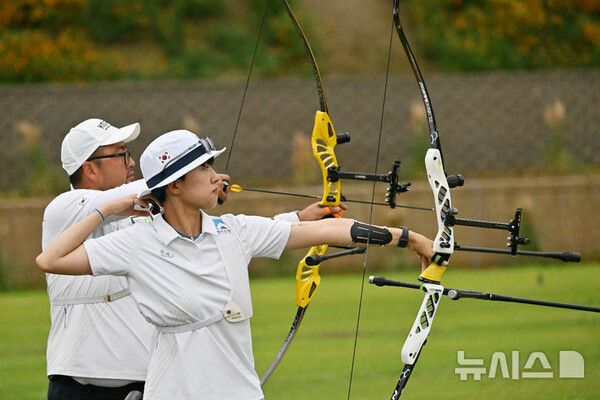 한국 양궁 대표팀 '막강 듀오' 김우진(청주시청)-안산(광주은행) 조가 2025 광주 세계양궁선수권대회 리커브 혼성 단체전 결승에서 스페인에 가로막혀 은메달을 목에 걸었다.