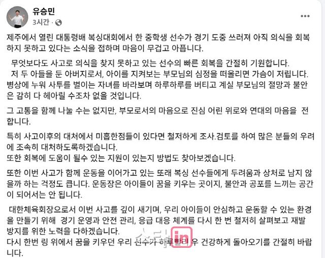유 회장은 “대한체육회장으로 이번 사고를 깊이 생기고, 우리 아이들이 안심하고 운동할 완경을 만들기 위해 경기 운영과 안전 관리, 응급 대응 체계를 철저히 살피고 재발 방지를 위한 노력을 다할 것”이라고 다짐했다.
