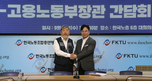 김 장관은 이날 오후 서울 여의도 한국노동조합총연맹(한국노총) 사옥을 방문해 김동명 한국노총 위원장 등과 만났다. 지난 7월 25일 이후 두 번째 회동이다.