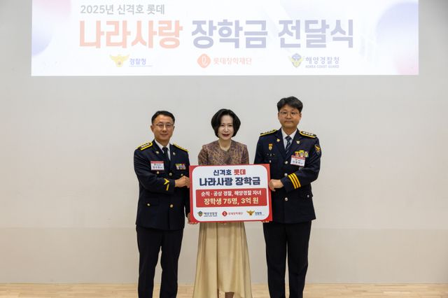 롯데장학재단이 ‘신격호 롯데 나라사랑 장학금 전달식’을 열고, 국가를 위해 공무를 수행하던 중 순직하거나 부상당한 경찰관 및 해양경찰관 자녀 75명에 장학금 총 3억원을 지원한다.